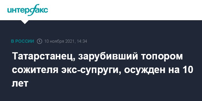 Москва. 10 ноября. INTERFAX.RU - Верховный суд Татарстана вынес приговор 38-летнему жителю Набережных Челнов, который угрожал убийством бывшей жене и зарубил топором ее сожителя, сообщает пресс-служба прокуратуры республики.