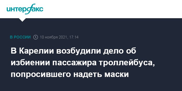 Москва. 10 ноября. INTERFAX.RU - Следственное управление МВД Карелии возбудило уголовное дело после избиения неизвестными молодого человека в ответ на просьбу надеть маски в троллейбусе в Петрозаводске, сообщает в среду центр управления регионом (ЦУР).