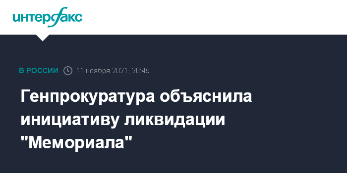 Москва. 11 ноября. INTERFAX.RU - В Генпрокуратуре РФ пояснили, что обращение в суд о ликвидации признанного НКО-иноагентом "Мемориала" связано с нарушениями этой организацией закона, в том числе о статусе иностранного агента.