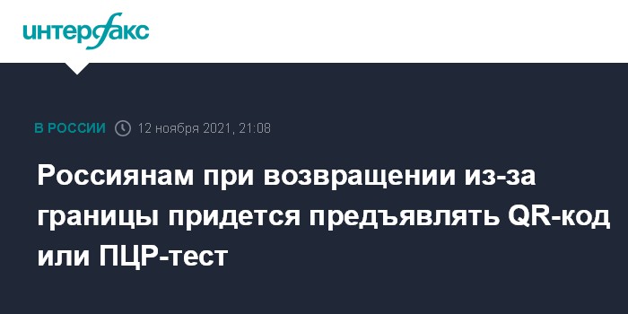 Москва. 12 ноября. INTERFAX.RU - Гражданам России, которые во время действия законов о QR-кодах для международных поездок будут возвращаться на родину из-за границы, придется при посадке на самолет или поезд предъявлять QR-код о вакцинации или результаты ПЦР-теста, следует из законопроекта № 17358-8.