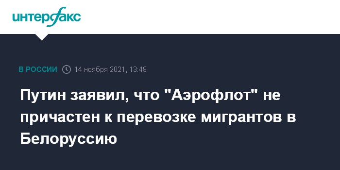 Москва. 14 ноября. INTERFAX.RU - Президент РФ Владимир Путин заявил, что предположения о причастности "Аэрофлота" к кризису на границе Белоруссии и ЕС - это попытки тех, кто виновен в этой ситуации, снять с себя ответственность.