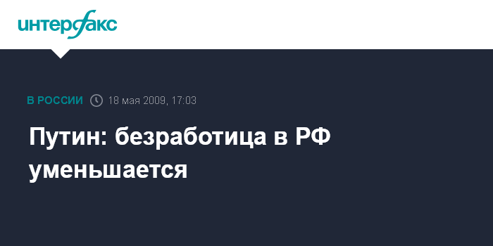Москва. 18 мая. INTERFAX.RU - На рынке труда зафиксирована положительная тенденция сокращения числа официально зарегистрированных безработных, заявил премьер-министр РФ Владимир Путин на президиуме правительства в понедельник. "Тенденция первая есть положительная на рынке труда - сокращение зарегистрированных безработных в службе занятости. Будем надеяться, что это, хотя бы отчасти, результат нашей деятельности. Вместе с тем ситуация остается сложной и прошу не расслабляться", - сказал он.