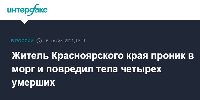 Москва. 15 ноября. INTERFAX.RU - Житель Курагино в Красноярском крае пробрался в морг при районной больнице и повредил тела нескольких умерших, сообщает пресс-служба Главного управления МВД по региону в понедельник.