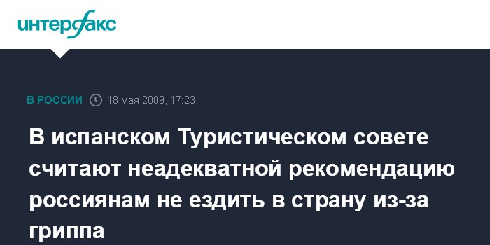 Москва. 18 мая. INTERFAX.RU - Туристический совет Испании в понедельник называет тревожным решение властей России порекомендовать своим гражданам воздержаться от поездок в Испанию в связи со вспышкой на ее территории вируса гриппа А/H1N1. "Предложение воздержаться от поездок в Испанию является неуместным и непропорциональным", - говорится в заявлении совета. "Эта мера может иметь вредные последствия для туризма Испании", - подчеркнул президент Туристического совета Испании Хуан Андрес Мелиан.