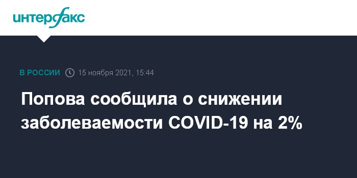 Москва. 15 ноября. INTERFAX.RU - По итогам прошедшей недели Роспотребнадзор впервые заметил снижение заболеваемости коронавирусной инфекцией на 2% после двух месяцев непрерывного роста, сообщила в президиуме координационного совета при правительстве глава ведомства Анна Попова.