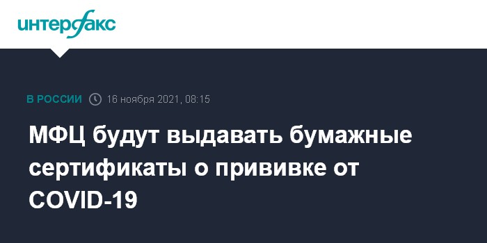 Москва. 16 ноября. INTERFAX.RU - C 16 ноября в многофункциональных центрах можно получить бумажный сертификат о вакцинации. Об этом ранее объявил премьер-министр Михаил Мишустин, соответствующее постановление правительства уже подписано.