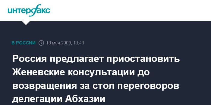 Женева. 18 мая. INTERFAX.RU - Россия предложила приостановить консультации по безопасности в Закавказье, которые открылись в понедельник в Женеве, до тех пор, пока не удастся вернуть за стол переговоров абхазскую делегацию.