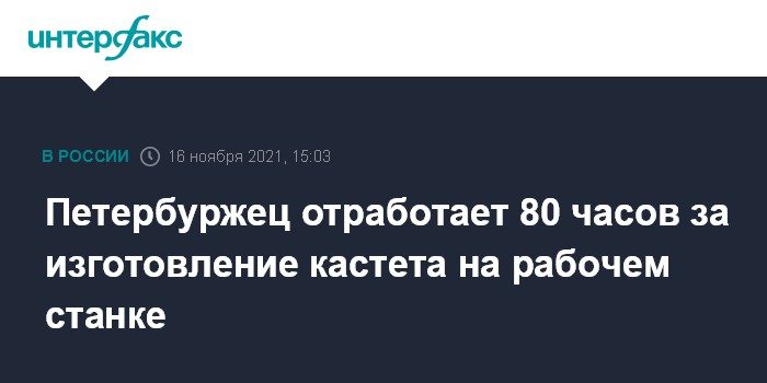 Москва. 16 ноября. INTERFAX.RU - Рабочий Колпинского металообрабатывающего завода Александр Сергеев приговорен к 80 часам обязательных работ за изготовление кастета на рабочем станке, сообщила пресс-служба городских судов Петербурга.