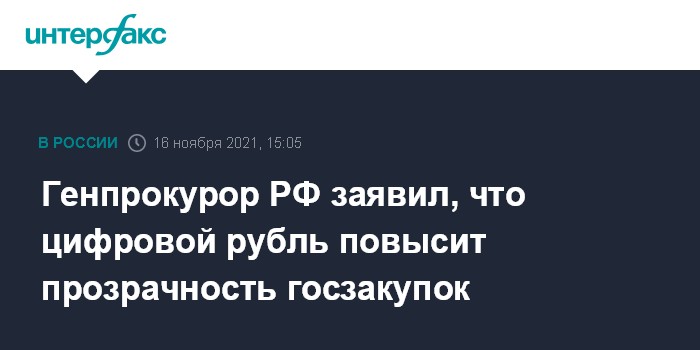 Москва. 16 ноября. INTERFAX.RU - Возможное ведение Центральным банком цифрового рубля позволит повысить прозрачность проведения государственных закупок в РФ, заявил генпрокурор Игорь Краснов в ходе выступления в Госдуме.