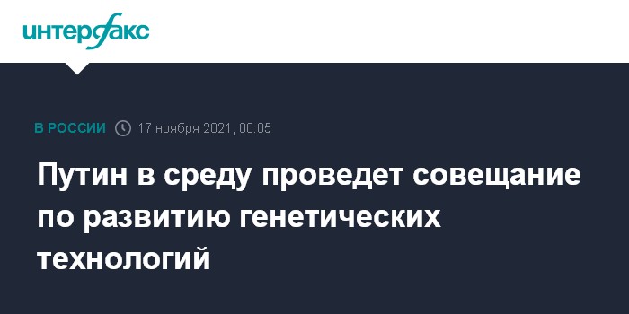 Москва. 17 ноября. INTERFAX.RU - Президент РФ Владимир Путин в среду проведет совещание по вопросам развития генетических технологий в России, сообщила пресс-служба Кремля.