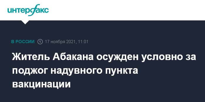 Москва. 17 ноября. INTERFAX.RU - Городской суд Абакана сообщил, что приговорил к условному сроку местного жителя за поджог мобильного пункта вакцинации от коронавируса. Он признал вину, и его дело рассматривали в особом порядке.