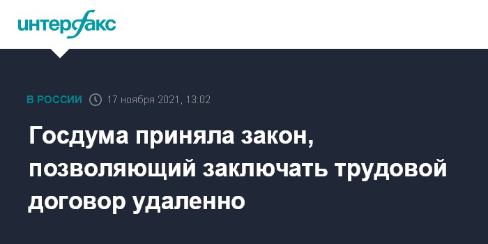 Москва. 17 ноября. INTERFAX.RU - Госдума на заседании в среду приняла в третьем, окончательном чтении закон об электронном документообороте в сфере трудовых отношений, позволяющий, в частности, заключать трудовой договор удаленно.