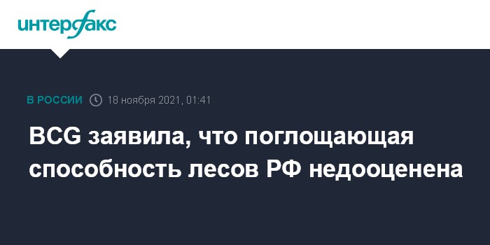 Москва. 18 ноября. INTERFAX.RU - Поглощающая способность российских лесов существенно недооценена, реальные значения могут составлять 1,8-2,2 млрд тонн CO2 эквивалента в год против текущих 0,6 млрд тонн, говорится в докладе The Boston Consulting Group (BCG), с которым ознакомился "Интерфакс".