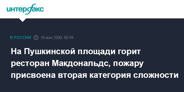 Москва. 19 мая. ИНТЕРФАКС - Пожар произошел на крыше ресторана Макдональдс по адресу Тверская дом 19, сообщил "Интерфаксу" начальник пресс-службы ГУ МЧС по Москве Евгений Бобылев.
