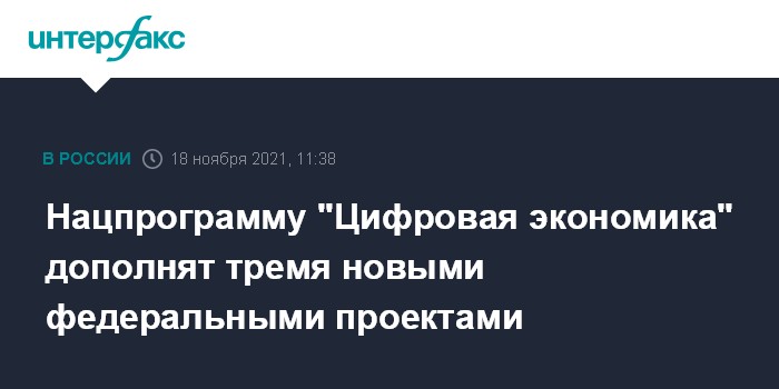 Москва. 18 ноября. INTERFAX.RU - В нацпрограмме "Цифровая экономика" появятся три новых федеральных проекта для достижения задач по цифровой трансформации, поставленных правительством в рамках 42 инициатив социально-экономического развития страны, сообщил "Интерфаксу" вице-премьер Дмитрий Чернышенко.
