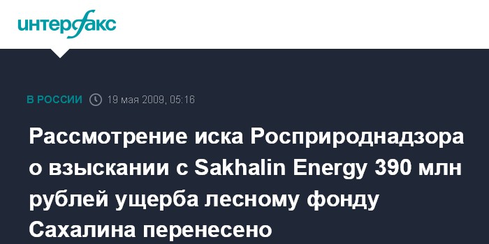 Южно-Сахалинск. 19 мая. ИНТЕРФАКС - ДАЛЬНИЙ ВОСТОК - В Сахалинском арбитражном суде в понедельник в очередной раз было перенесено заседание по рассмотрению иска Федеральной службы по надзору в сфере природопользования (Росприроднадзор) о взыскании с Sakhalin Energy 390 млн рублей ущерба лесному фонду острова Сахалин.