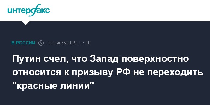 Москва. 18 ноября. INTERFAX.RU - Президент РФ Владимир Путин заявил, что Запад обостряет ситуацию и очень поверхностно относится к предупреждениям России не переходить "красные линии".
