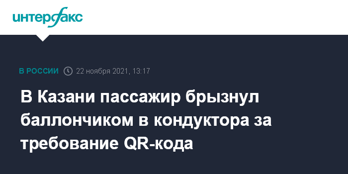 Москва. 22 ноября. INTERFAX.RU - Кондуктор автобуса пострадала в понедельник от пассажира, напавшего на нее с кулаками и брызнувшего ей в лицо перцовым баллончиком после просьбы предьявить QR-код. Об этом сообщил "Интерфаксу" председатель ассоциации автотранспортных предприятий Татарстана Сергей Темляков в понедельник.