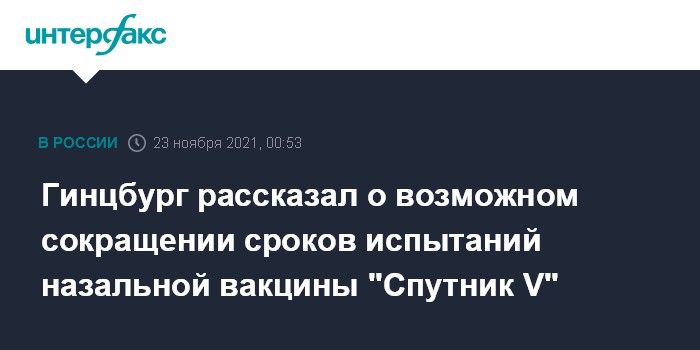 Москва. 23 ноября. INTERFAX.RU - Сроки клинических исследований интраназальной формы "Спутника V" (в виде спрея для носа) могут быть сокращены, так как оригинальный препарат уже показал себя в прививочных кампаниях в РФ и за рубежом, сообщил "Интерфаксу" глава центра им.Гамалеи Минздрава России, академик РАН Александр Гинцбург.