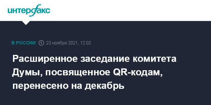 Ранее сообщалось, что 24 ноября в Госдуме должно было состояться расширенное заседание комитета, посвященное QR-кодам, с участием главы Минцифры Максута Шадаева, главы Минздрава Михаила Мурашко и руководителя Роспотребнадзора Анны Поповой.