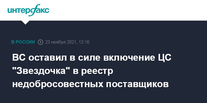 ВС оставил в силе включение ЦС "Звездочка" в реестр недобросовестных поставщиков
