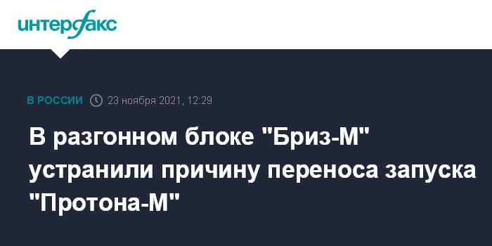 Москва. 23 ноября. INTERFAX.RU - Специалисты Центра Хруничева устранили замечание в разгонном блоке "Бриз-М", из-за которого был перенесен запуск ракеты "Протон-М" со спутниками "Экспресс", сообщили в "Роскосмосе" во вторник.