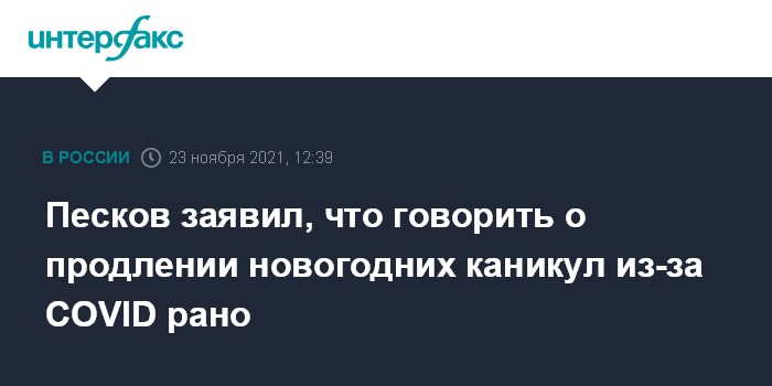 Москва. 23 ноября. INTERFAX.RU - Пресс-секретарь президента РФ Дмитрий Песков посчитал преждевременным вопрос о продлении новогодних праздников из-за эпидемиологической ситуации в стране.
