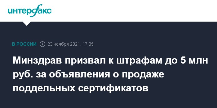 Минздрав призвал к штрафам до 5 млн руб. за объявления о продаже поддельных сертификатов