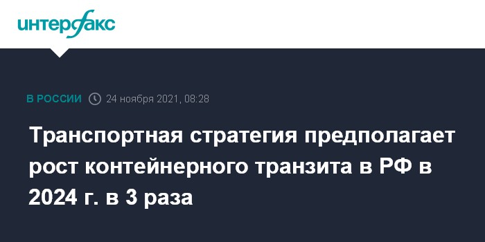 Москва. 24 ноября. INTERFAX.RU - Транзитные контейнерные перевозки по территории РФ (всеми видами транспорта) в 2024 году вырастут в 3,2 раза к "допандемийному" 2019 году. Это следует из проекта транспортной стратегии до 2030 года с прогнозом до 2035-го, с которым ознакомился "Интерфакс".