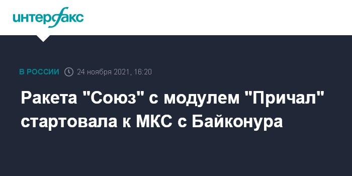 Москва. 24 ноября. INTERFAX.RU - Ракета-носитель "Союз-2.1б" с узловым модулем "Причал" стартовала к Международной космической станции (МКС) с космодрома Байконур, следует из трансляции "Роскосмоса".