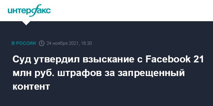 Google, Twitter и Meta грозит до 48 млн руб. штрафов из-за запрещенного контентаЧитать подробнее"Пять постановлений суда, которыми Facebook Inc назначены штрафы на сумму 21 млн рублей, оставлены без изменения, апелляционные жалобы без удовлетворения", - сообщила "Интерфаксу" пресс-секретарь суда Зульфия Гуринчук.