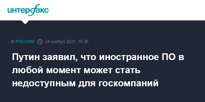Москва. 24 ноября. INTERFAX.RU - Президент РФ Владимир Путин поддержал предложение о введении персональной ответственности глав госкомпаний за исполнение требований по переходу на отечественное ПО, заявив, что иностранный софт в любой момент может оказаться недоступен, и руководители должны это понимать.