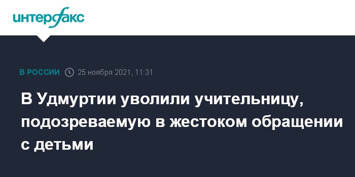 Москва. 25 ноября. INTERFAX.RU - Подозреваемая в жестоком обращении с детьми учительница Красногорской гимназии в Удмуртии уволена, сообщила уполномоченный по правам ребенка в республике Ольга Авдеева.