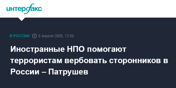 Москва. 8 апреля. INTERFAX.RU - Некоторые иностранные неправительственные организации (НПО) помогают международным террористам вести вербовку на российской территории, заявил глава ФСБ Николай Патрушев. "Результаты анализа оперативной обстановки в Южном федеральном округе свидетельствуют о том, что бандиты и их пособники прилагают усилия по идеологической обработке молодежи и пополнению своих рядов", - сообщил он во вторник в Москве на заседании Национального антитеррористического комитета (НАК)