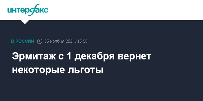 "Мы можем вернуть некоторые льготы с 1 декабря. (...) Дети до 14 лет будут проходить бесплатно в любой день в Эрмитаж. (...) Инвалиды первой и второй групп, дети-инвалиды с одним сопровождающим – тоже бесплатно в любой день", - сказал руководитель.