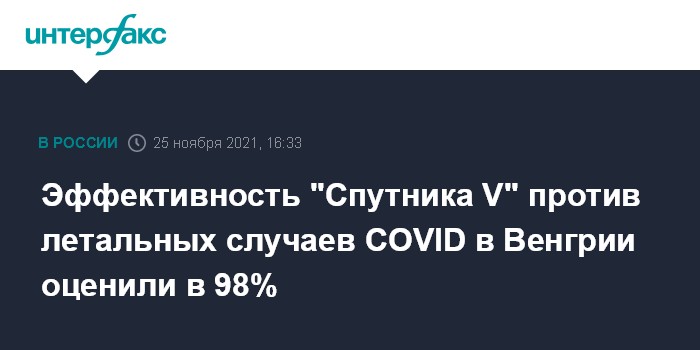 Москва. 25 ноября. INTERFAX.RU - Российская вакцина "Спутник V" в ходе вакцинации населения Венгрии показала лучшую эффективность против летальных случаев коронавируса по сравнению с препаратами Moderna, Pfizer, Sinopharm и AstraZeneca - на уровне 98%, эффективность против заражения составила 85,7%, сообщил в четверг Российский фонд прямых инвестиций (РФПИ).