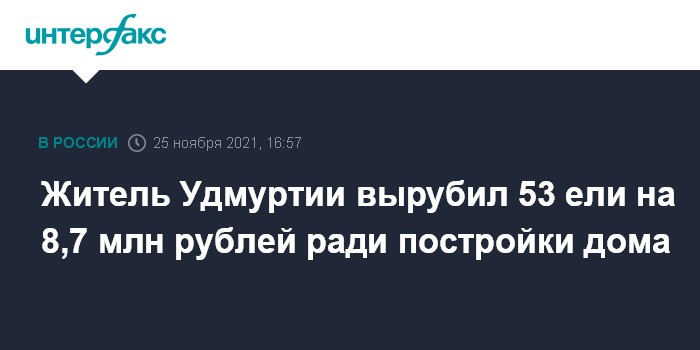 Москва. 25 ноября. INTERFAX.RU - Житель Кезского района Удмуртии подозревается в незаконной вырубке 53 деревьев, сообщает пресс-служба МВД РФ в четверг.