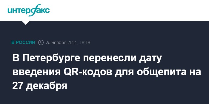 В свою очередь, в пресс-службе администрации губернатора Петербурга сообщили, что "для предприятий общественного питания и объектов розничной торговли с 1 декабря на 27 декабря переносится срок введения условий о доступе на их территорию только посетителей, завершивших вакцинацию, перенесших заболевание либо имеющих медицинский отвод".