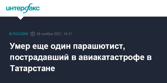 Москва. 26 ноября. INTERFAX.RU - Уфимский парашютист Вадим Фахрутдинов, пострадавший в авиакатастрофе под Мензелинском (Татарстан), скончался в больнице. Об этом сообщил "Интерфаксу" председатель Федерации парашютного спорта Башкирии Гайрат Манаев в пятницу.