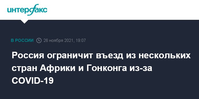 "С 00 часов 00 минут 28 ноября 2021 года ограничить въезд на территорию России иностранных граждан, проживающих на территории Южно-Африканской Республики, Республики Ботсвана, Королевстве Лесото, Республики Намибия, Республики Зимбабве, Республики Мозамбик, Республики Мадагаскар, Королевстве Эсватини, Объединенной Республике Танзания, Специального административного района Гонконг", - сообщил оперштаб в пятницу.