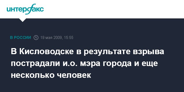 Москва. 19 мая. INTERFAX.RU - В городе-курорте Кисловодске (Ставропольский край) днем во вторник произошел взрыв близ здания администрации города. В результате пострадала исполняющая полномочия главы города Наталья Луценко, ее водитель и несколько прохожих.
