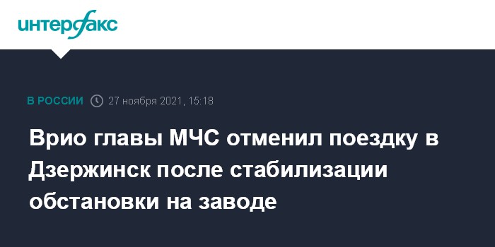 "В связи с улучшением оперативной обстановки на месте происшествия в Дзержинск Нижегородской области работа оперативной группы центрального аппарата МЧС России не потребуется. Поездка отменена", - говорится в сообщении.