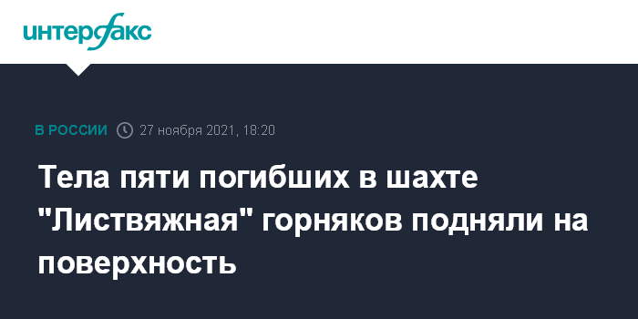Москва. 27 ноября. INTERFAX.RU - Пять тел погибших в шахте "Листвяжная" в Кемеровской области горняков обнаружены и подняты на поверхность, сообщает пресс-служба МЧС РФ в субботу.
