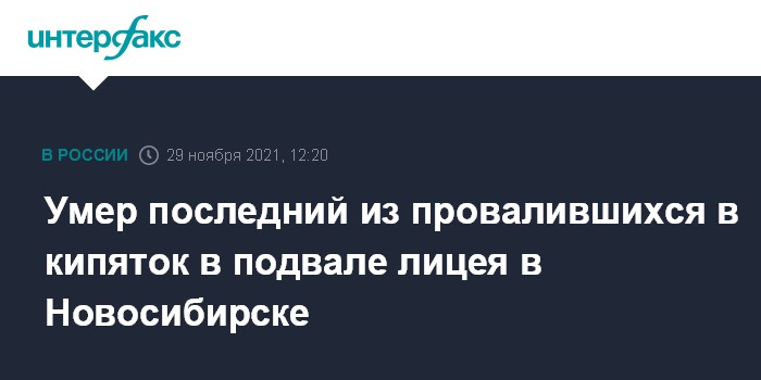 Москва. 29 ноября. INTERFAX.RU - В Новосибирске умер последний из трех рабочих, которые утром 1 ноября провалились в яму с кипятком в подвале лицея №12, сообщили "Интерфаксу" в Новосибирской областной клинической больнице.