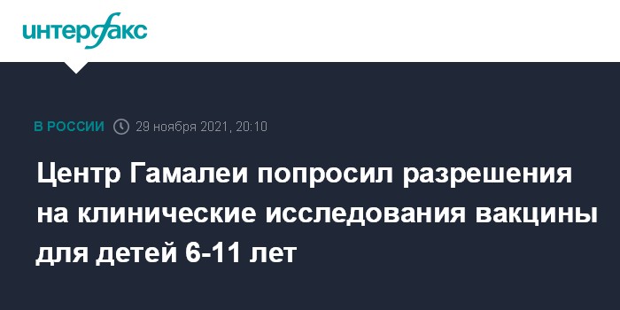 Москва. 29 ноября. INTERFAX.RU - Центр имени Гамалеи обратился в Минздрав России за разрешением на проведение клинических исследований вакцины от коронавируса для детей в возрасте от 6 до 11 лет, сообщил "Интерфаксу" глава центра Александр Гинцбург.
