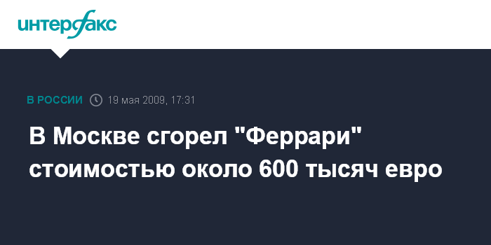 Москва. 19 мая. INTERFAX.RU - На западе Москвы сгорел новый эксклюзивный спортивный автомобиль "Феррари" стоимостью около 600 тыс. евро, сообщил "Интерфаксу" источник в правоохранительных органах города во вторник.