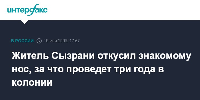 Самара. 19 мая. INTERFAX.RU - Городской суд Сызрани (Самарская область) приговорил к трем годам колонии общего режима Михаила Задорнова, который укусил своего знакомого за нос так сильно, что лицо того стало безобразным.