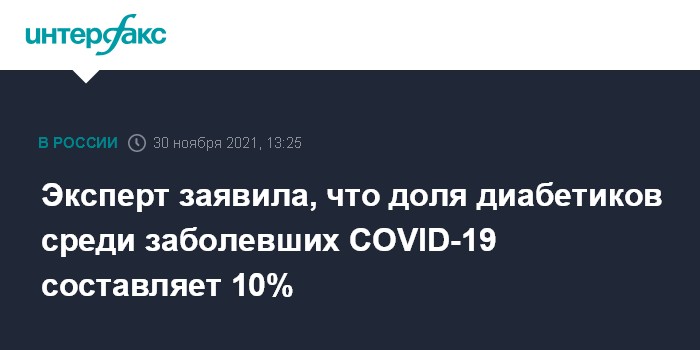 Москва. 30 ноября. INTERFAX.RU - Порядка 10% зараженных коронавирусом болеют сахарным диабетом; из-за пандемии COVID-19 снизилась выявляемость этого заболевания, сообщила главный внештатный эндокринолог Минздрава РФ в Центральном федеральном округе, заведующая кафедрой эндокринологии Института клинической медицины имени Склифосовского 1-го Московского государственного медицинского университета имени Сеченова Нина Петунина.