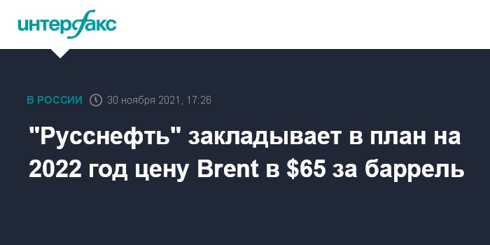 Москва. 30 ноября. INTERFAX.RU - "Русснефть" закладывает в бизнес-план на 2022 год цену нефти марки Brent в $65 за баррель, а цену Urals - на уровне $63 за баррель. Об этом "Интерфаксу" сообщили в компании.