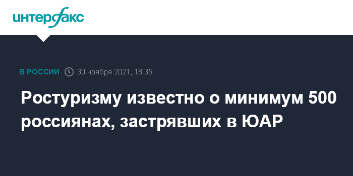 Москва. 30 ноября. INTERFAX.RU - Из-за прекращения авиасообщения в ЮАР застряли не менее 500 россиян, организованных туристов среди них нет, сообщила пресс-служба Ростуризма ссылаясь на данные российского генконсульства в Кейптауне.